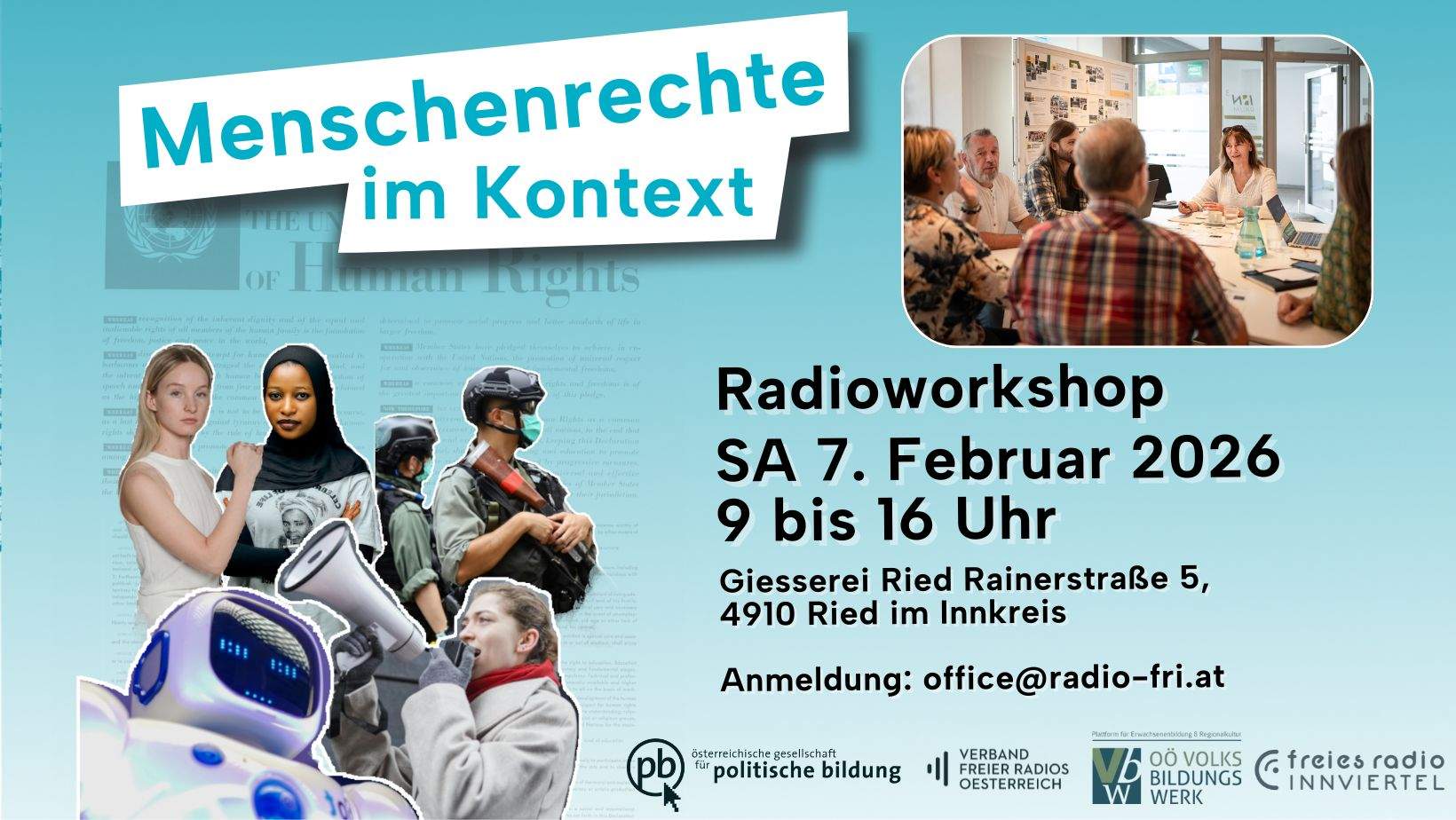 Als Freies Radio Innviertel laden wir im Zuge unseres Projekts zur politischen Bildung „Menschenrechte im Kontext.“ Radiomacher:innen in Spe und Interessierte zu einem Tagesworkshop in Ried im Innkreis ein.